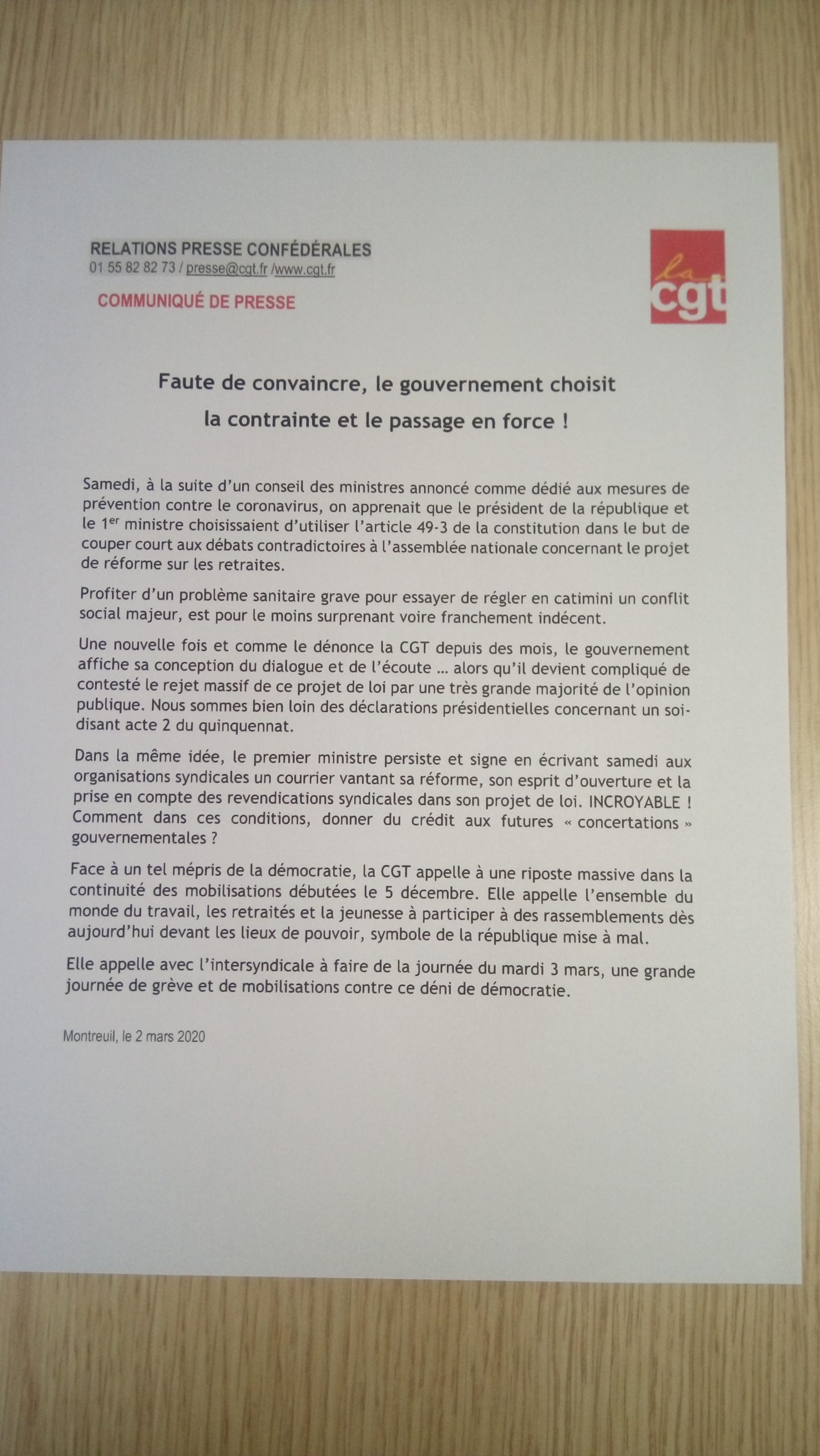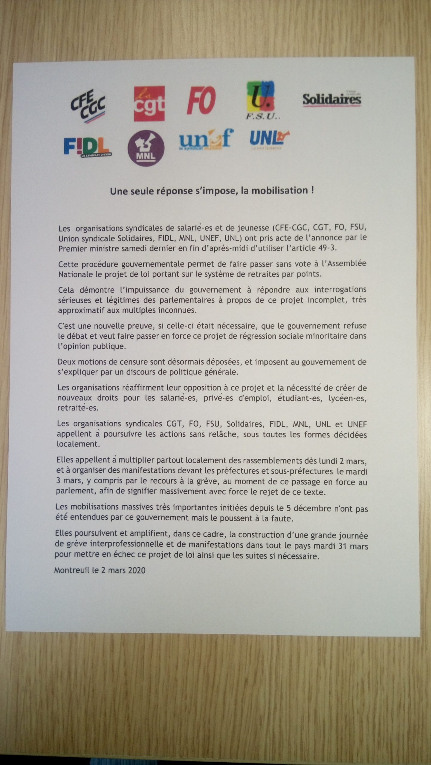 Face au 49-3 une seule réponse s’impose, la mobilisation…le 3 mars à 10h30 !! Tweeter Partager Partager Imprimer cet article Télécharger cet article 2 mars 2020