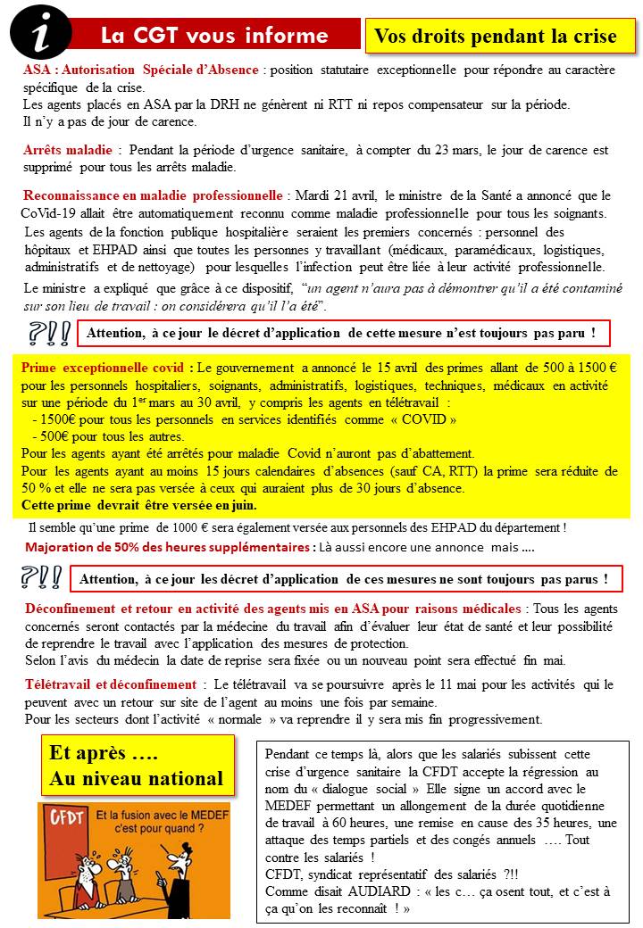 La CGT vous informe : Vos droits pendant la crise Covid Tweeter Partager Partager Imprimer cet article Télécharger cet article 23 mai 2020