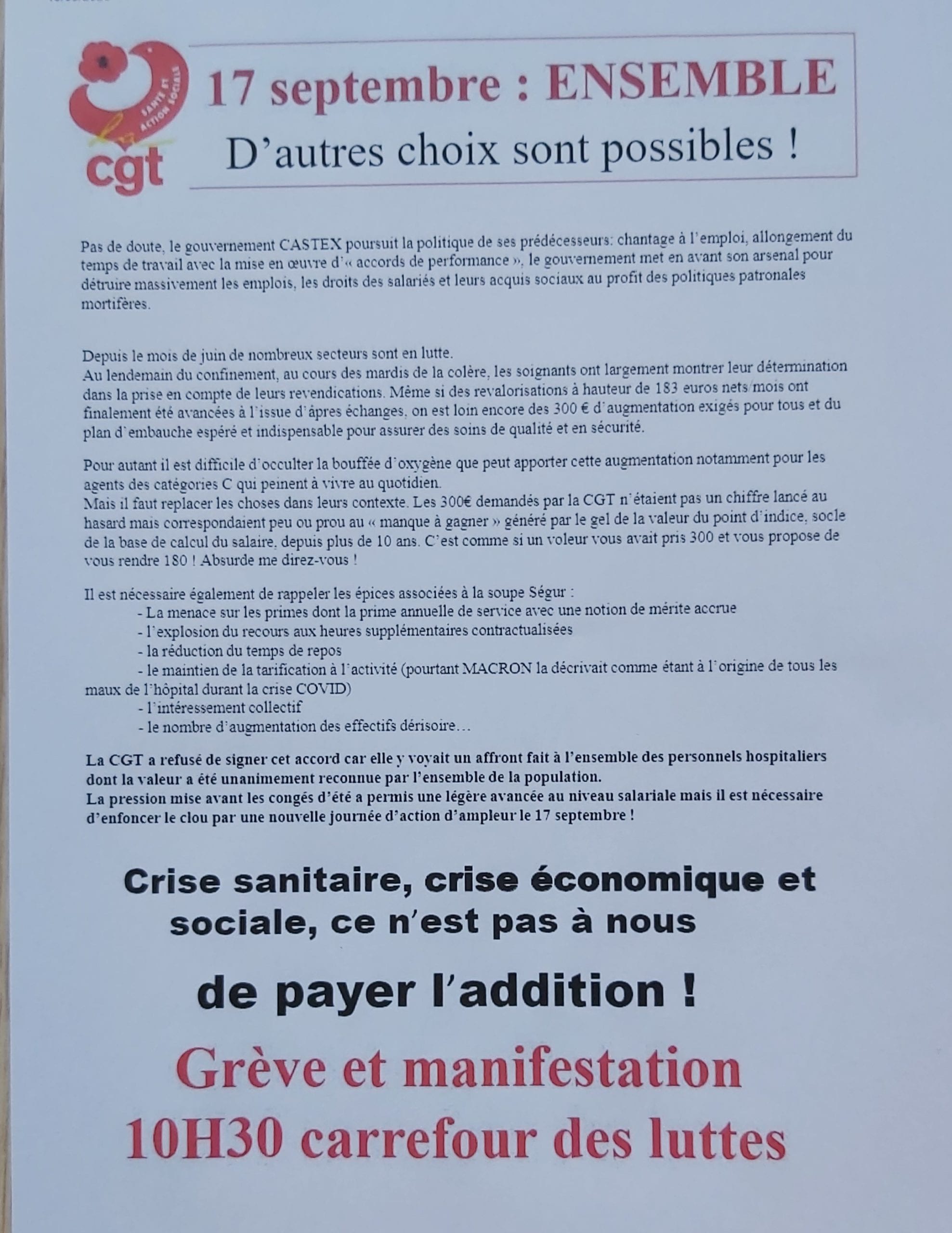 Le 17 septembre, grève et manif 10h30 carrefour Tourny Tweeter Partager Partager Imprimer cet article Télécharger cet article 10 septembre 2020
