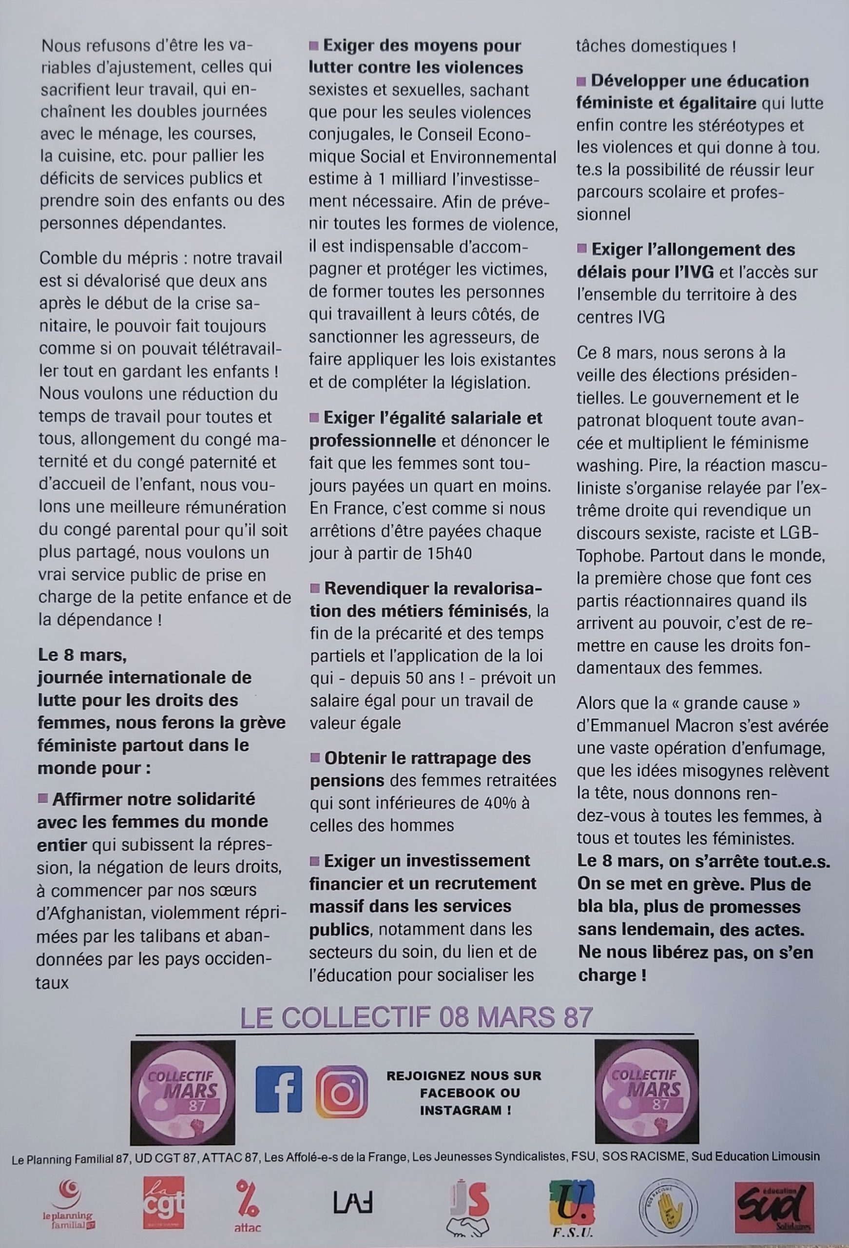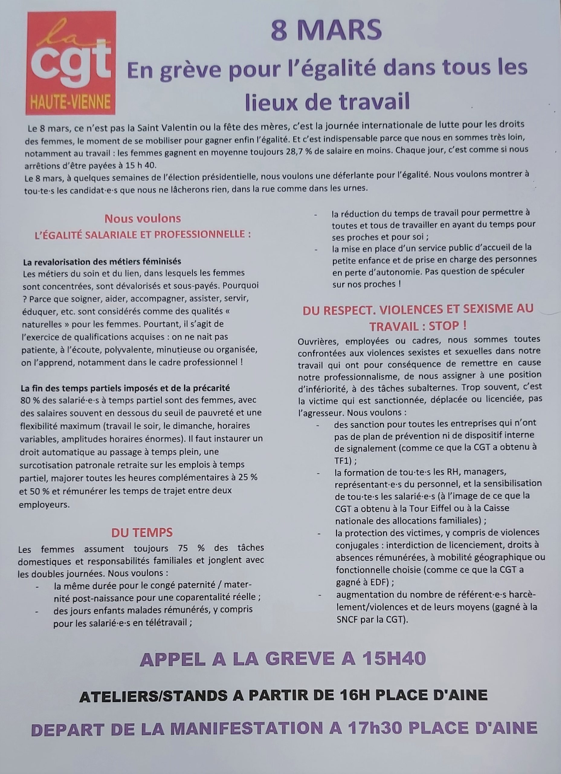 Le 8 mars : Grève et manifestation à partir de 15h40 place d’Aine Tweeter Partager Partager Imprimer cet article Télécharger cet article 2 mars 2022
