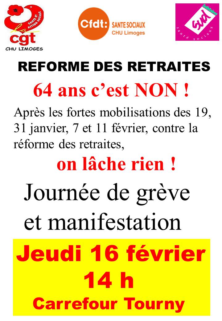 Grève et manif jeudi 16 février 2023 : 14h00 carrefour Tourny Tweeter Partager Partager Imprimer cet article Télécharger cet article 14 février 2023